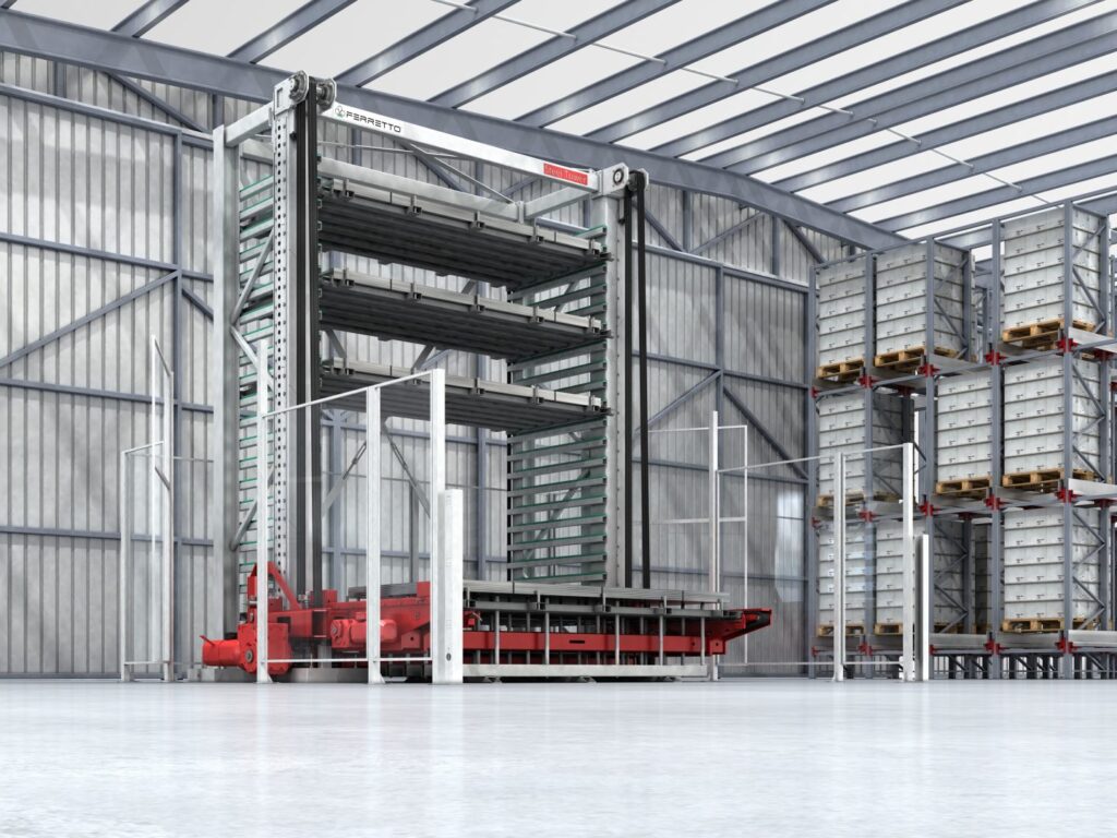 The loading and unloading of the unit load is performed by means of an elevator. For the metal sheets there is a frame for coupling and uncoupling the material in the tray.