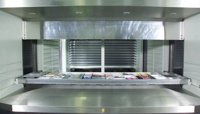 The Modula Cube is made up of multiple modules to build its overall length, where trays are stored in two columns within each module, one at the front and the other at the rear. Trays are transported between modules to operators at the access opening area via a shuttle that travels both vertically and horizontally within the unit. Trays move from the rear of the unit to the access opening location at the base of the modules.